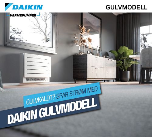Gulvkaldt? Daikin Gulvmodell har utblåsing på toppen av maskinen, samt nede ved gulvet.